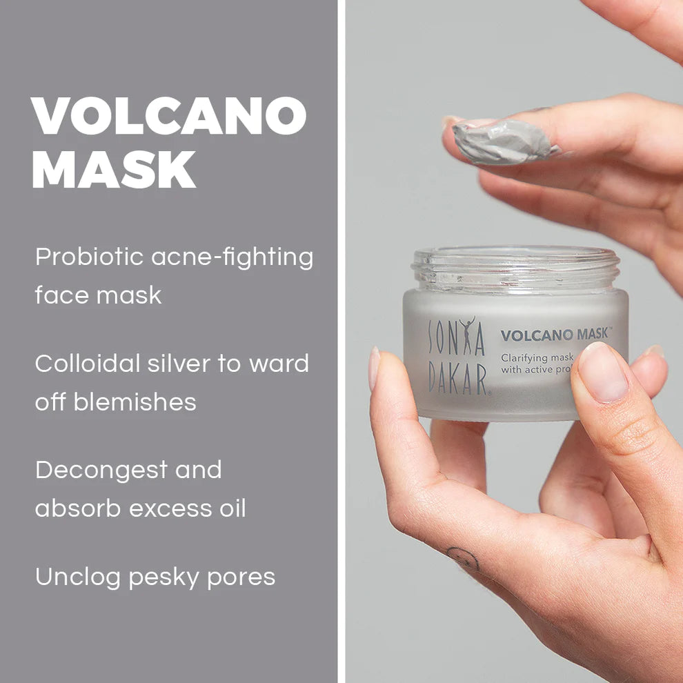 Clarifying mask with volcanic clay, active probiotics and colloidal silver. Ideal for oily and acne-prone skin. Dramatically minimizes pores & clears acne. All natural with no parabens, sulfates, artificial dyes or fragrance.